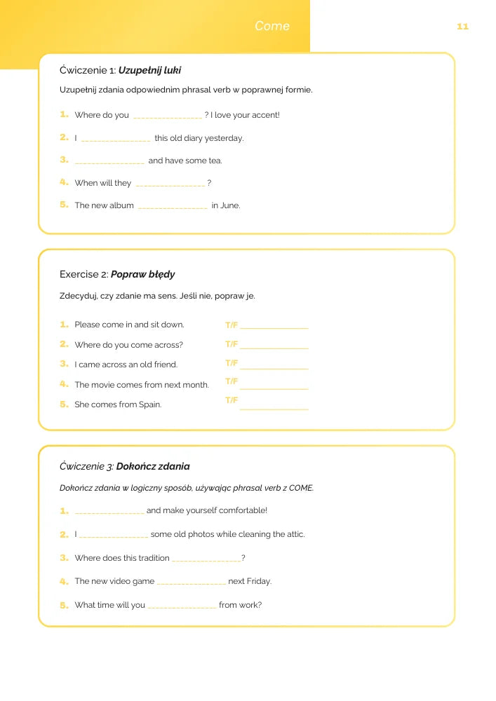 Nie uczysz się suchych definicji. Każda fraza ma przykład w użyciu i konkretne zadania, które pomogą Ci ją zapamiętać i zrozumieć, jak działa w zdaniu.