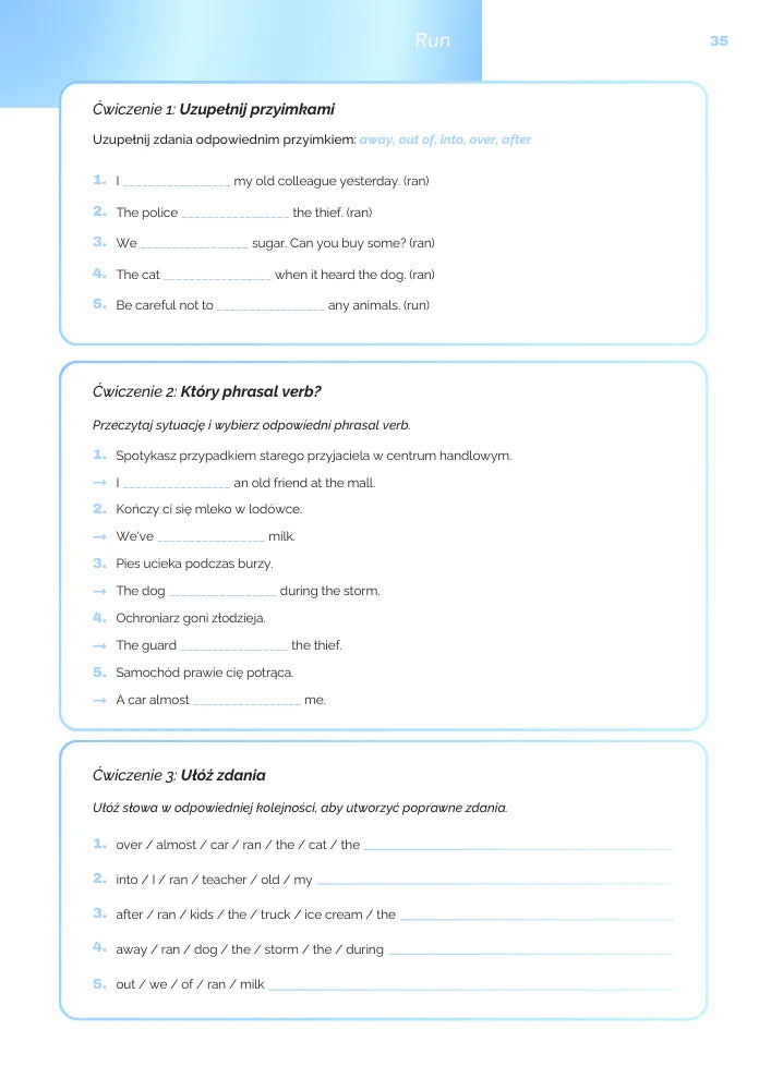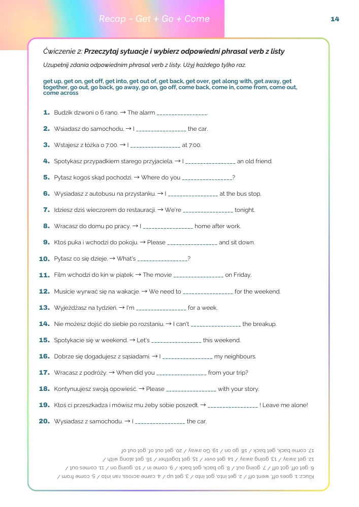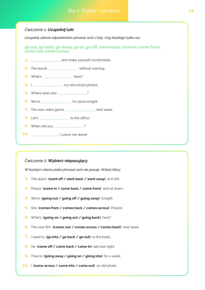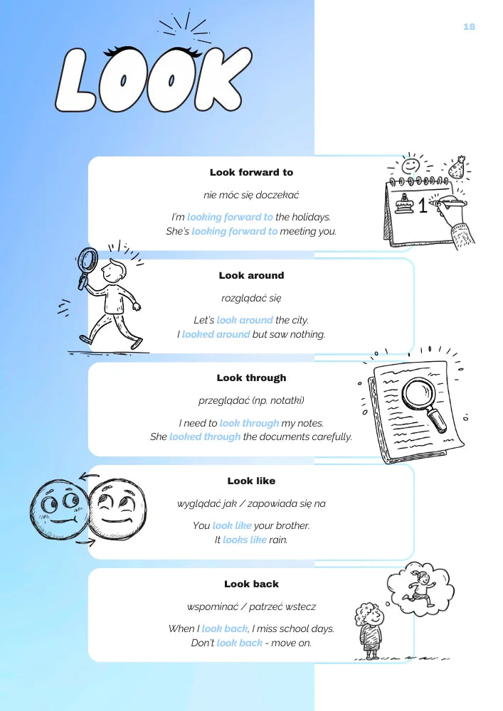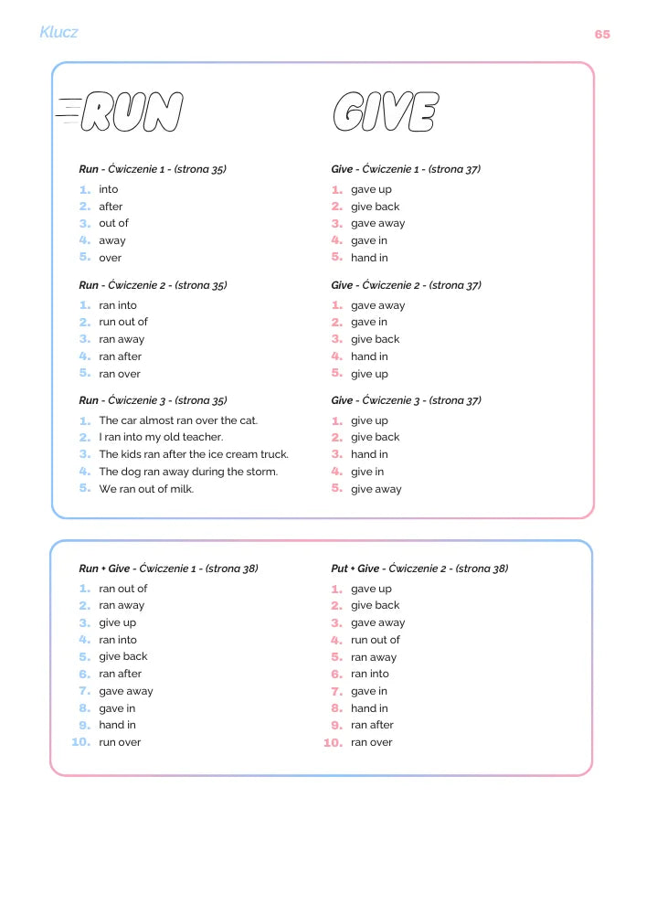 Podzieliliśmy materiał na 17 klarownych sekcji według czasowników: get, go, come, look, take, put, turn, run, give i wiele więcej wymaganych na egzaminie. Dzięki temu uczysz się phrasal verbs w logicznym układzie, bez chaosu i skakania po tematach.