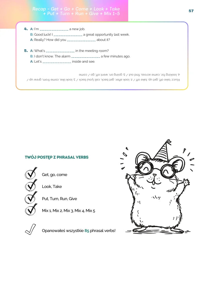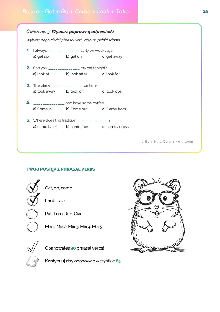 Gotowy klucz i system progresji pomogą Ci śledzić, które phrasal verbs masz już opanowane i zmotywują Cię do dalszej nauki!