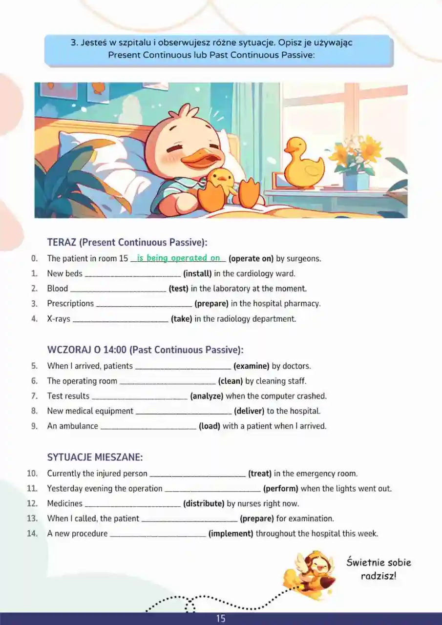 Od transformacji po kontekstowe scenariusze. Każde ćwiczenie zostało zaprojektowane tak, aby utrwalać wiedzę i budować automatyzm w użyciu strony biernej.