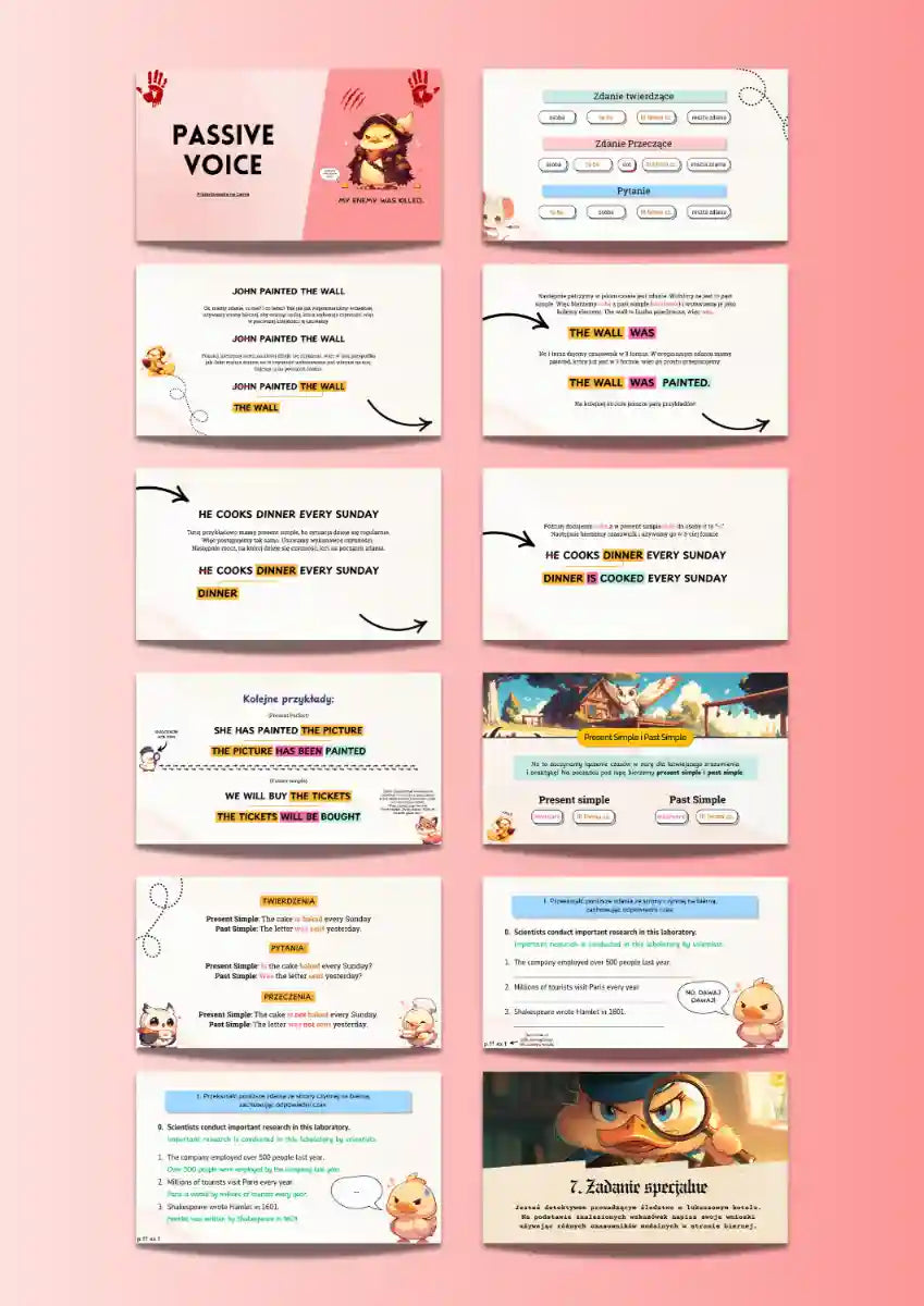 E-book do nauki Strony biernej (Passive Voice) składający się z pliku teoretycznego oraz gotowej prezentacji w formacie PDF