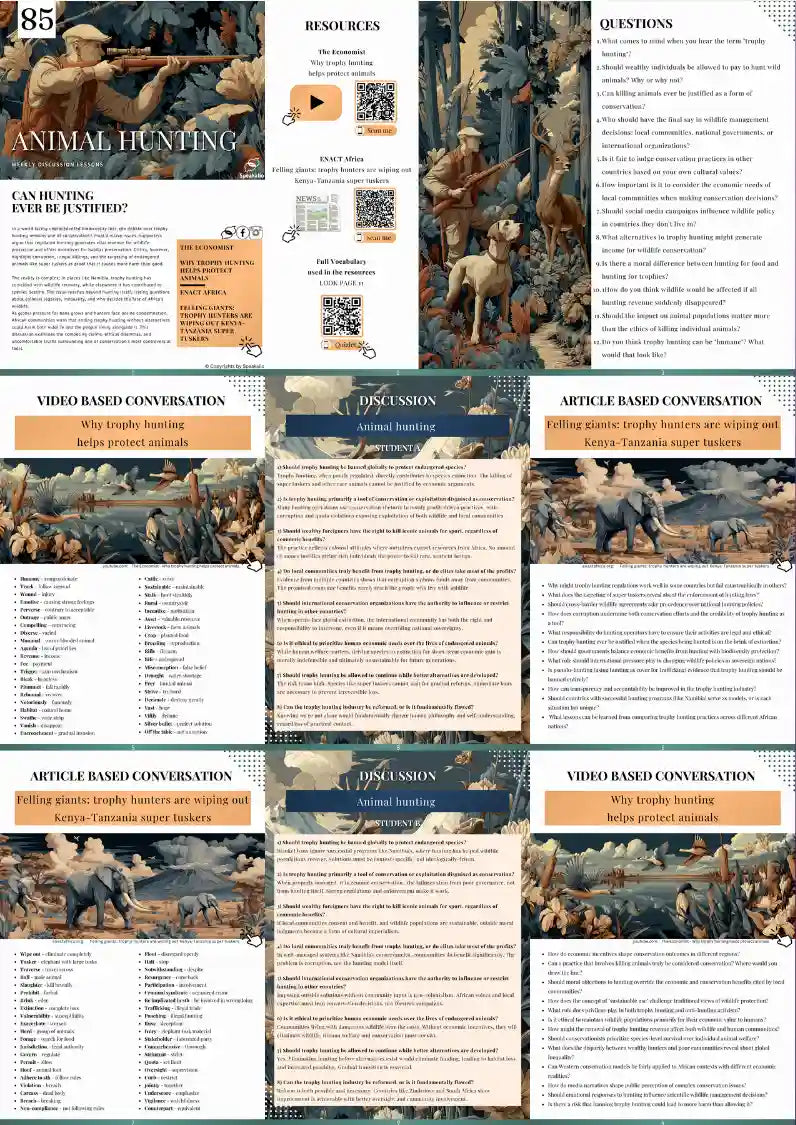 Arkusze dyskusyjne Speakalio pozwalają nauczycielom tworzyć lekcje pełne dyskusji, które rozwijają umiejętności językowe uczniów. Dla uczących się języka angielskiego i osób pragnących doskonalić swoje umiejętności językowe, dostarczają one autentyczne materiały do praktyki. To doskonały sposób na rozwijanie umiejętności konwersacyjnych.
