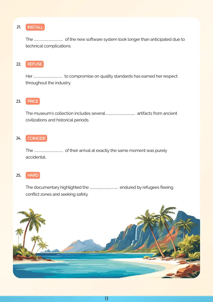 Ćwiczenia z Word Formation to jedno z największych wyzwań na egzaminie FCE. Ten ebook to obszerna baza zadań, która pozwoli Ci przećwiczyć ponad 300 transformacji w różnych wariantach i formatach - od pojedynczych zdań po teksty z lukami.